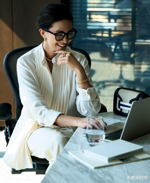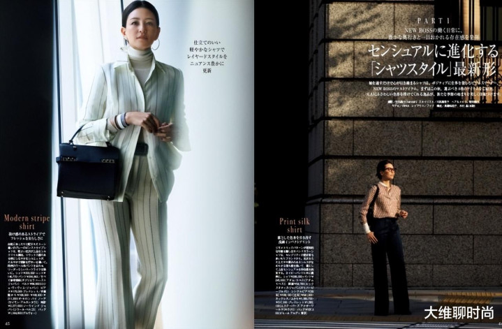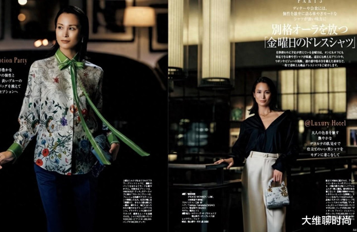 衬衫的穿着方式,如胸前的开衩程度等,显得既优雅又充满女人味,十分迷人。