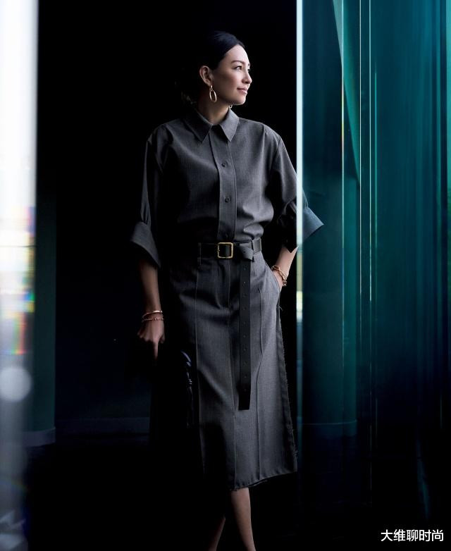 另一冠军来自本期备受关注的“衬衫风格”。深绿色纽扣衬衫采用弹性真丝斜纹绸,光泽与流畅轮廓彰显都市女性魅力。搭配宽松阔腿裤,突出上半身利落感,棕色腰带与手袋增添秋日气息,腰带扣饰、珠宝与太阳镜增添硬朗气质,这套帅气又优雅的搭配俘获了众多读者的心。